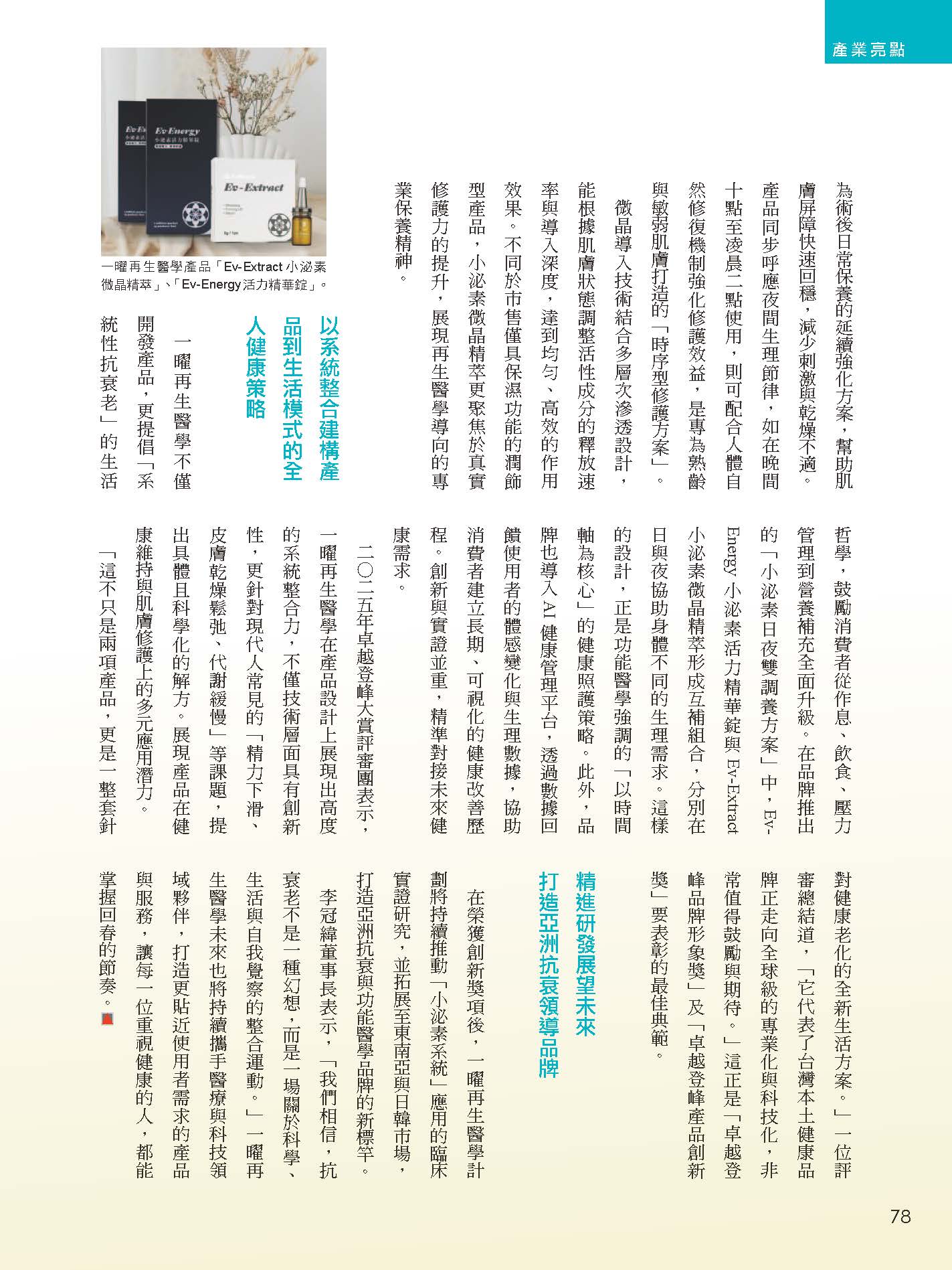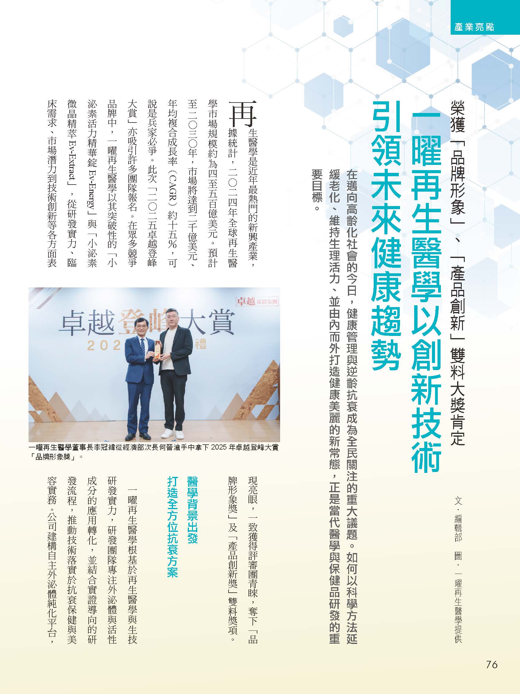 | 內 容 | 【榮耀時刻|一曜再生 x 曜群】 李冠緯董事長榮獲卓越雜誌產業亮點報導 這不只是一份榮耀,更是一份責任, 我們將持續深耕研發,用科學守護健康,以創新延續美麗與活力 下一步,我們會做得更好,一起引領亞洲健康未來! #卓越雜誌 #品牌形象獎 #產品創新獎 #一曜再生 #曜群 #小泌素 #健康新科技 #抗老趨勢 |