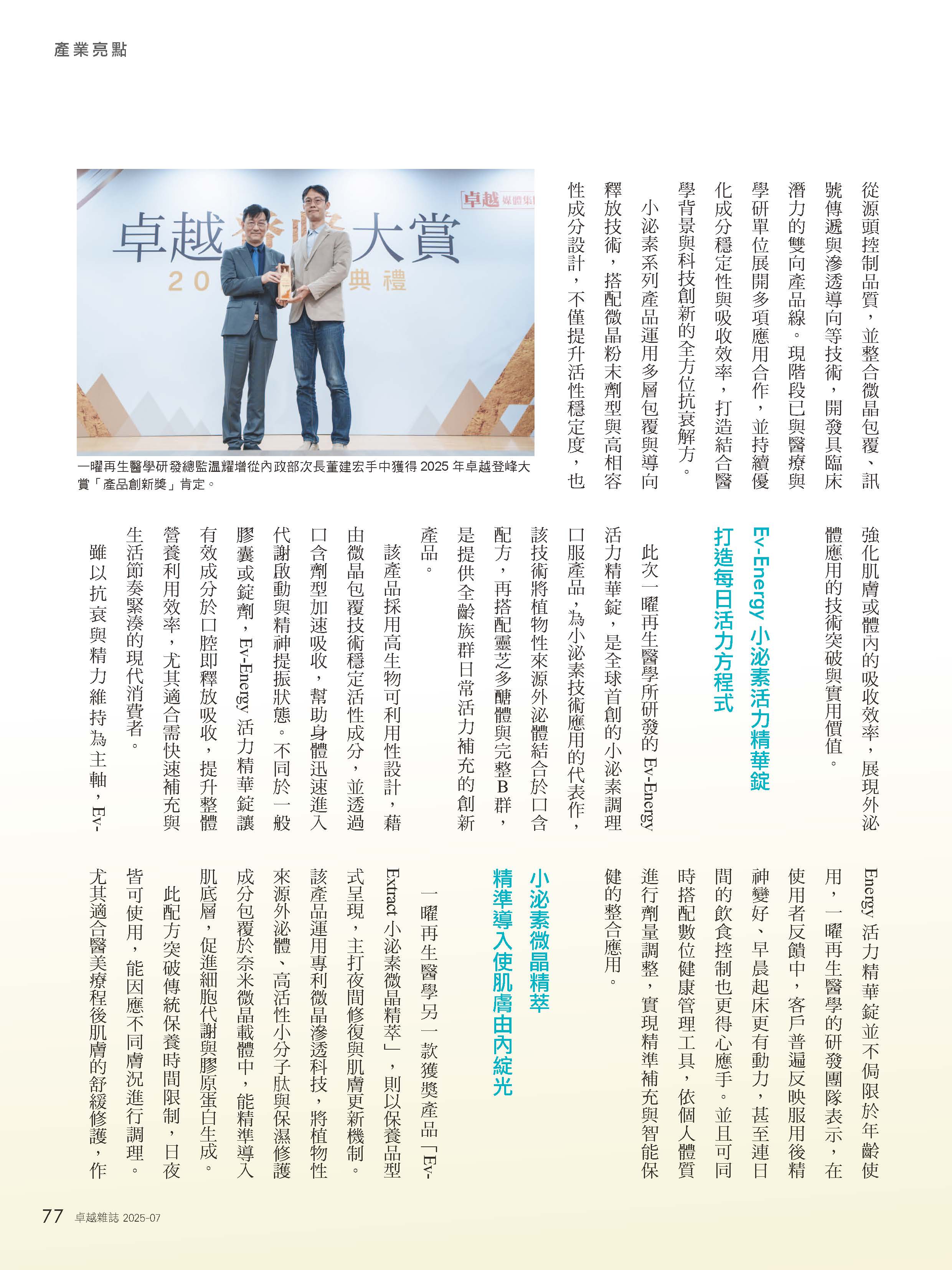 | 簡述內容 | 【榮耀時刻|一曜再生 x 曜群】李冠緯董事長榮獲卓越雜誌產業亮點報導 #品牌形象獎 #產品創新獎 這不只是一份榮耀,更是一份責任,我們將持續深耕研發,用科學守護健康,以創新延續美麗與活力! 下一步,我們會做得更好,一起引領亞洲健康未來! |